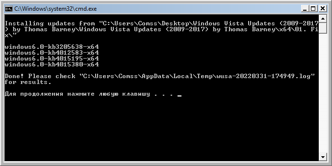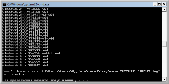 4. Установите все обновления из папки 02. Security Update. Для этого, запустите скрипт install_updates.bat. Так как будет установлено около 70 обновлений, это может занять продолжительное время. Когда появится сообщение Press any key to exit нажмите любую клавишу для закрытия окна. После этого перезагрузите систему.