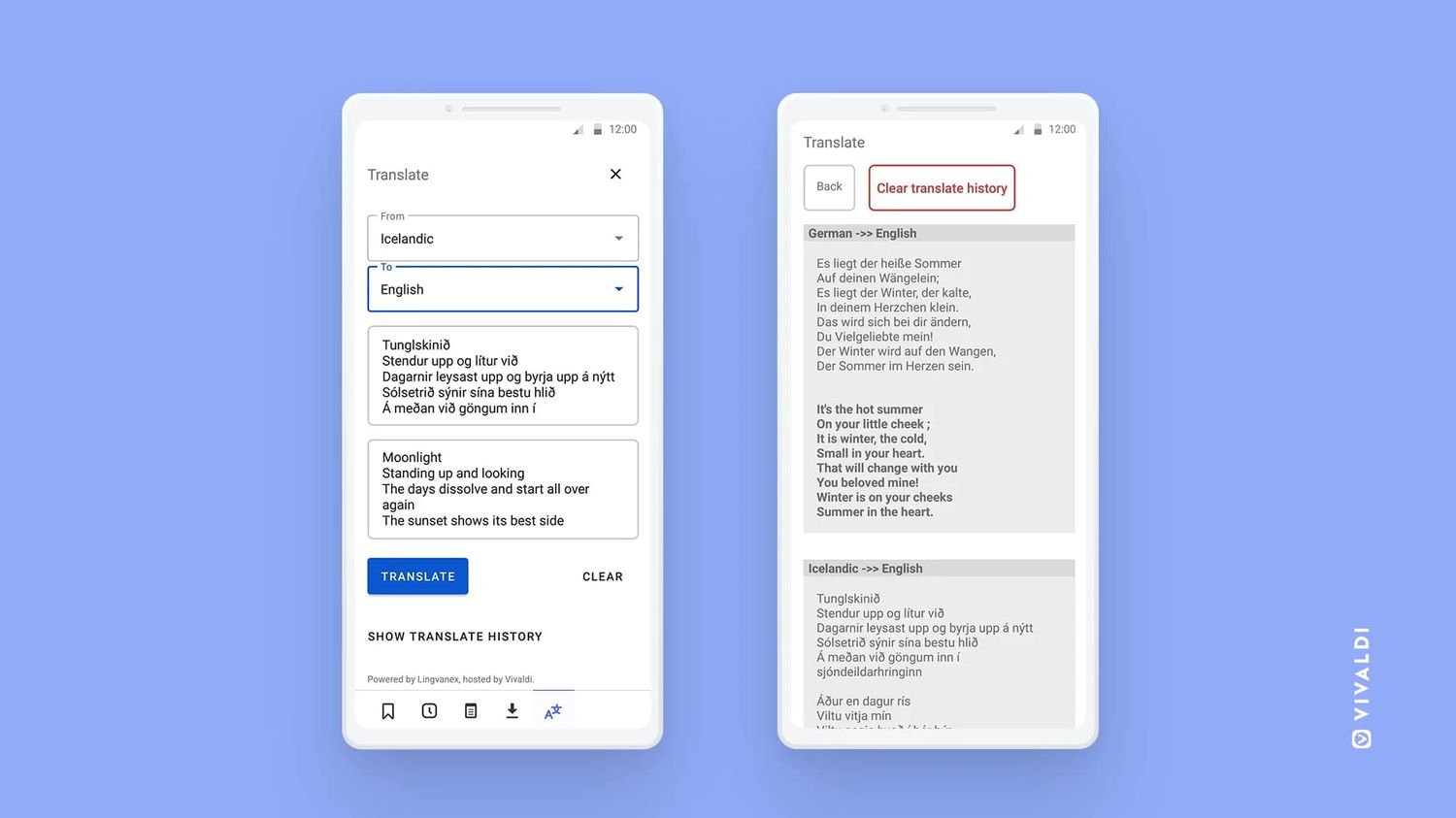 Новая панель перевода расширяет функциональные возможности переводчика Vivaldi, обеспечивающие конфиденциальность. Теперь пользователи могут переводить выделенный текст. Предусмотрена возможность просмотра оригинала и переведенного текста и быстрой смены исходного и целевого языка.