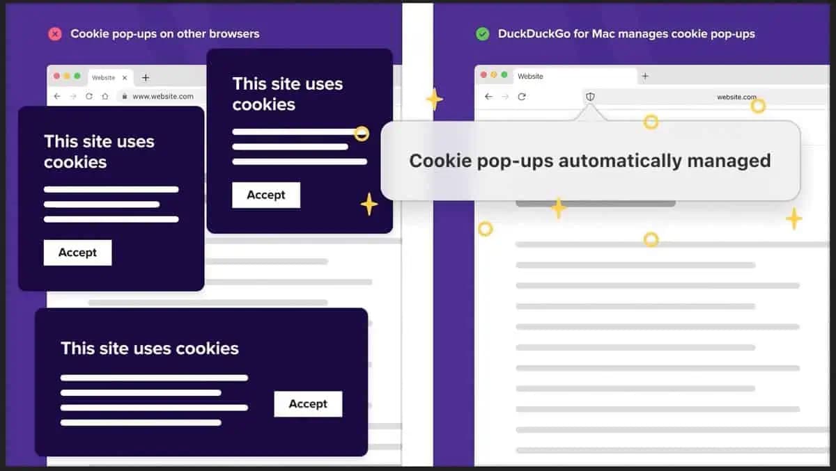 Duckduckgo для Mac также имеет автоматическую систему управления файлами куки и всплывающими окнами, которая минимизирует cookie для защиты конфиденциальности и скрывает раздражающие всплывающие окна, с которыми вы можете столкнуться на сайтах. Этот механизм в настоящее время работает примерно на 50% сайтов, и будет улучшен по мере прогресса разработки.
