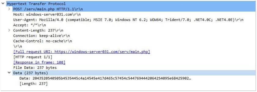 Все украденные данные копируются с помощью команды PowerShell во временную директорию пользователя, шифруются, а затем отправляются на командный сервер на домене windows-server031.com.