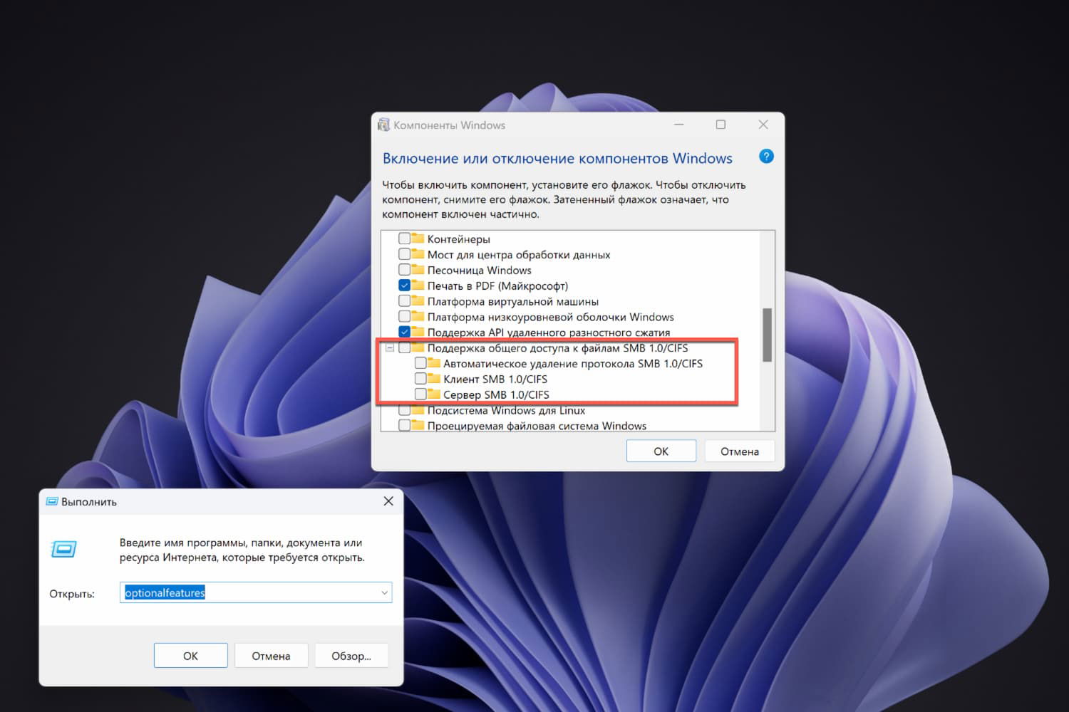 Чтобы включить поддержку SMB1 на вашем ПК, нажмите сочетание Win+R и введите команду optionalfeatures. Прокрутите список функций вниз и поставьте галочку рядом с опцией Поддержка общего доступа к файлам SMB 1.0/CIFS.