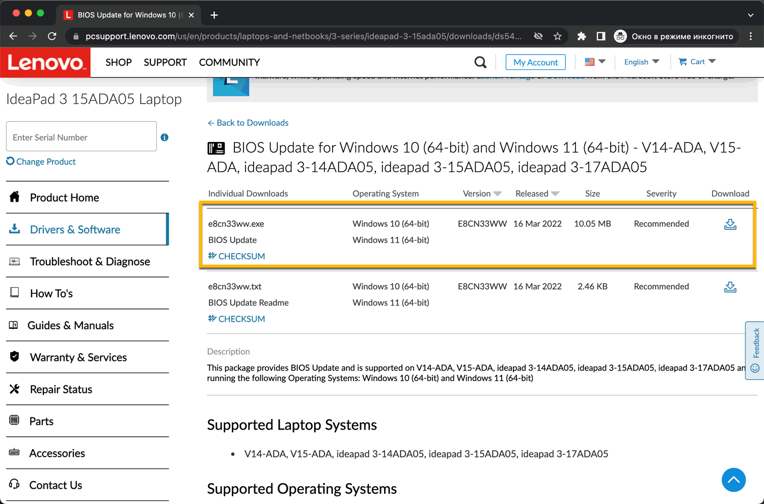 Затем нужно выбрать BIOS/UEFI, чтобы отобразить доступные обновления прошивки для загрузки обновления. На странице поддержки, посвященной уязвимостям, перечислены версии прошивки, содержащие исправления безопасности.