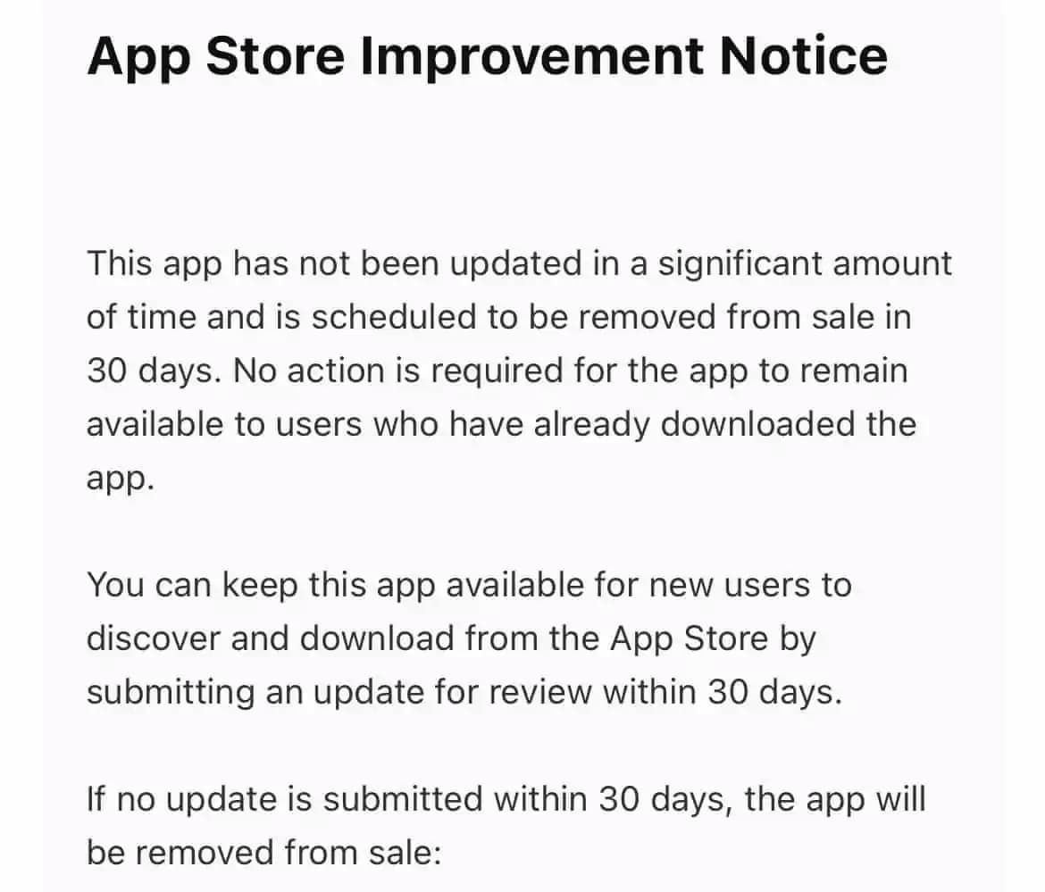 Разработчик инди-игр Роберт Кабве (Robert Kabwe) поделился скриншотом электронного сообщения под названием «Уведомление об улучшении App Store», которое он получил от Apple. В нем сообщается, что у разработчиков есть 30 дней на то, чтобы обновить свои приложений и отправить их на проверку. В противном случае приложения будут удалены из App Store. Данная информация продублирована на странице поддержки, посвященной улучшениям App Store.