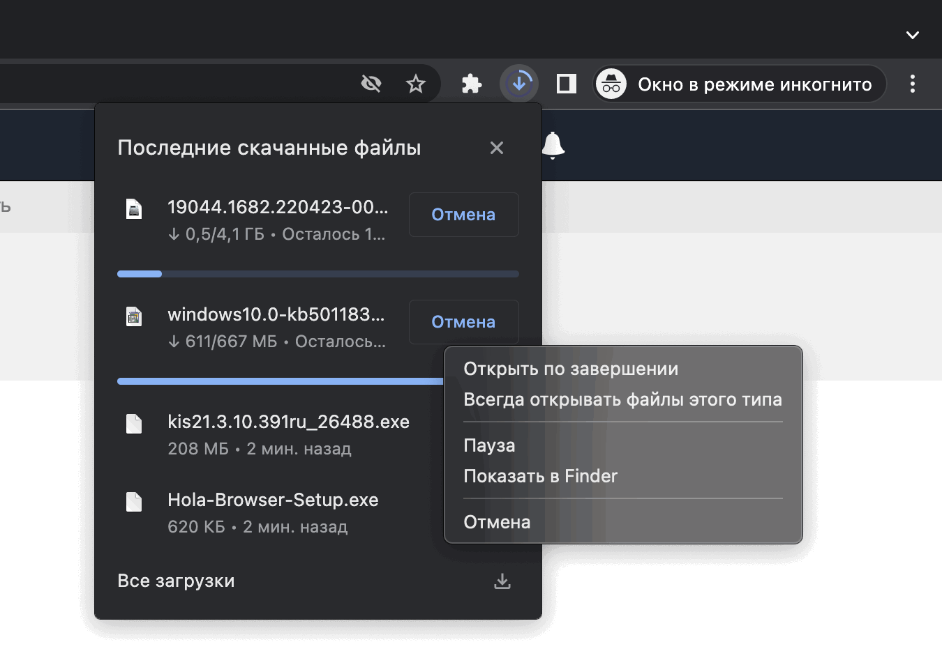 Chrome 101 продолжает улучшать этот интерфейс. На этот раз был добавлен индикатор выполнения при загрузке нескольких элементов. Вы можете щелкнуть правой кнопкой мыши, чтобы увидеть контекстное меню «Показать в папке» («Показать в Finder» – для macOS) и другие опции.