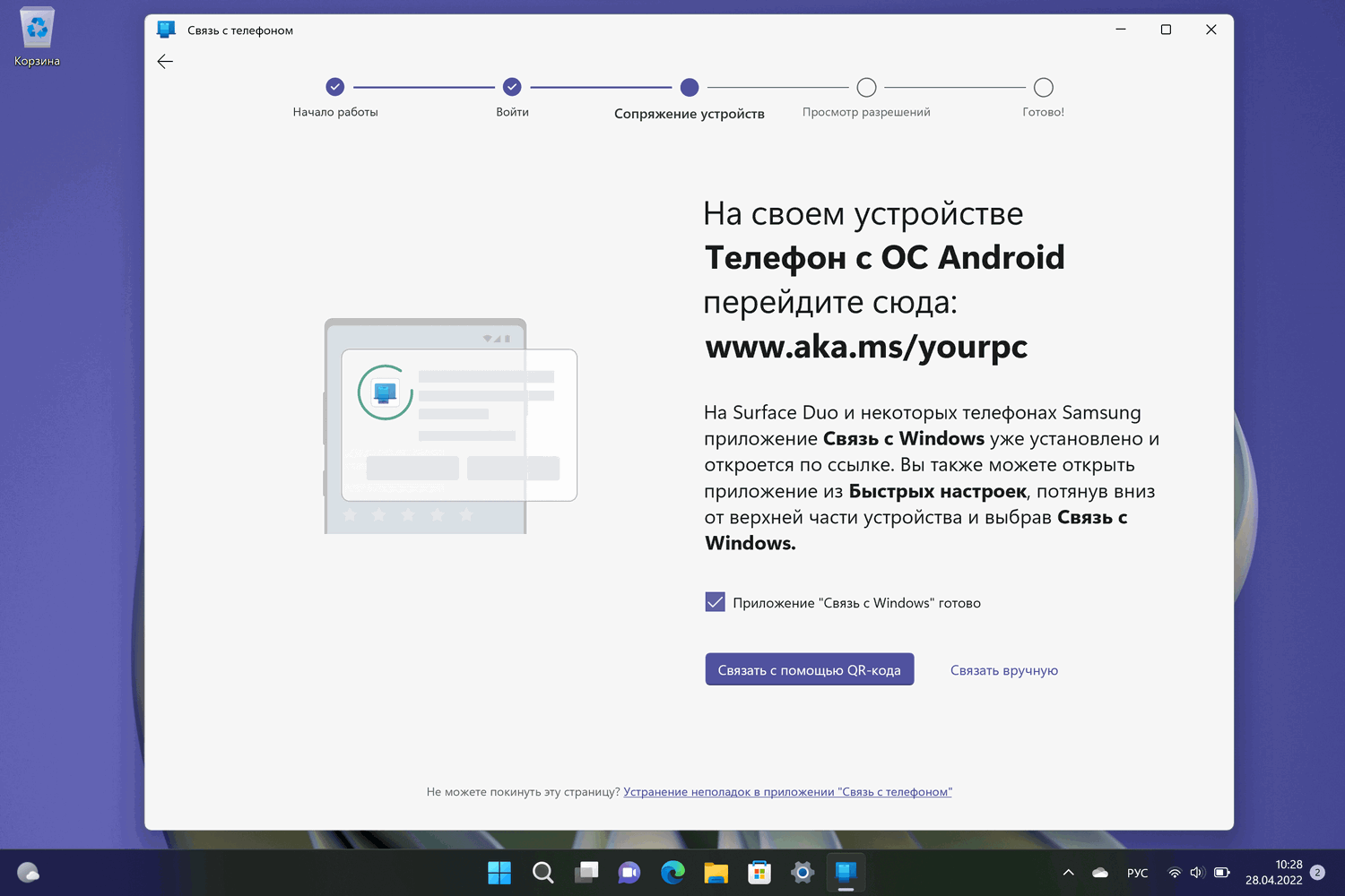 - Теперь вам будет предложено соединить ваши устройства, установите переключатель «Приложение "Связь с Windows" готово», это активирует две опции внизу, как показано ниже: