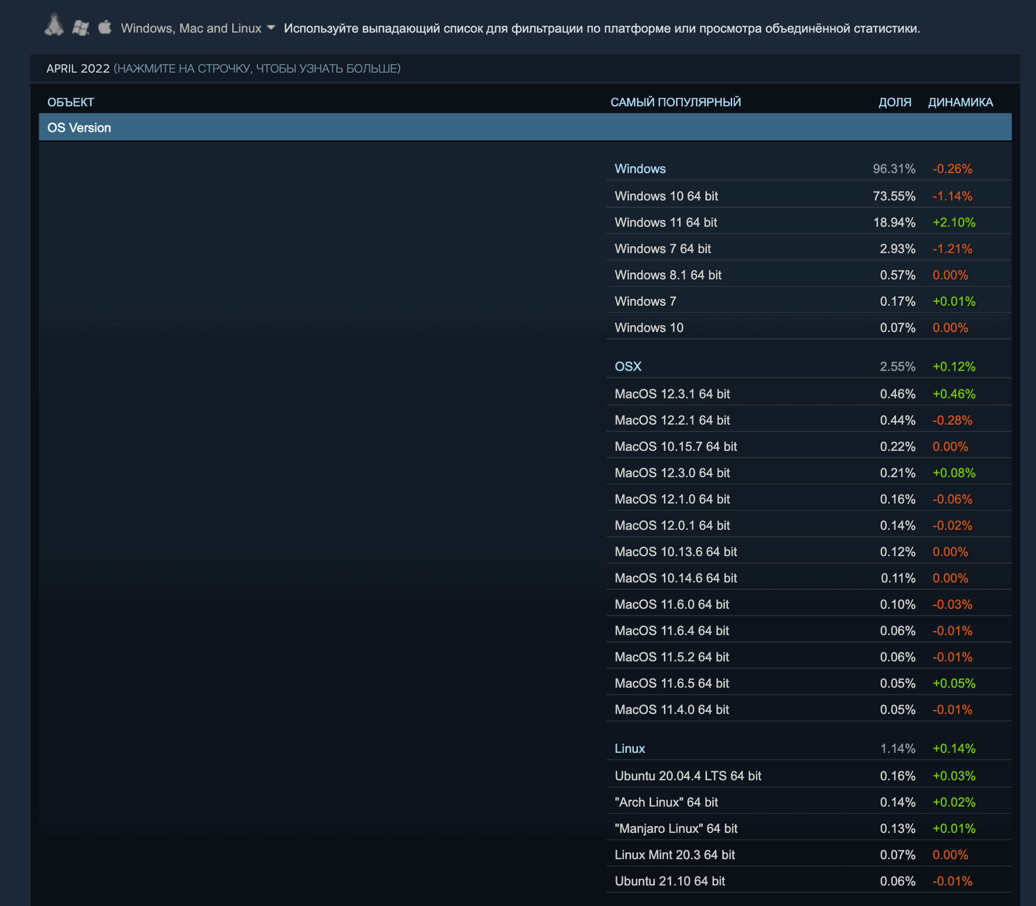 Как и Chrome на браузерном рынке, Windows сохраняет доминирующее положение среди игроков Steam с долей рынка 96,31% (-0,26% в апреле 2022 года). 64-разрядная версия Windows 10 остается самым популярным выбором — ее доля составляет 73,55% (-1,14%). 64-разрядная версия Windows 7 занимает третье место с 2,93% (-1,21%).