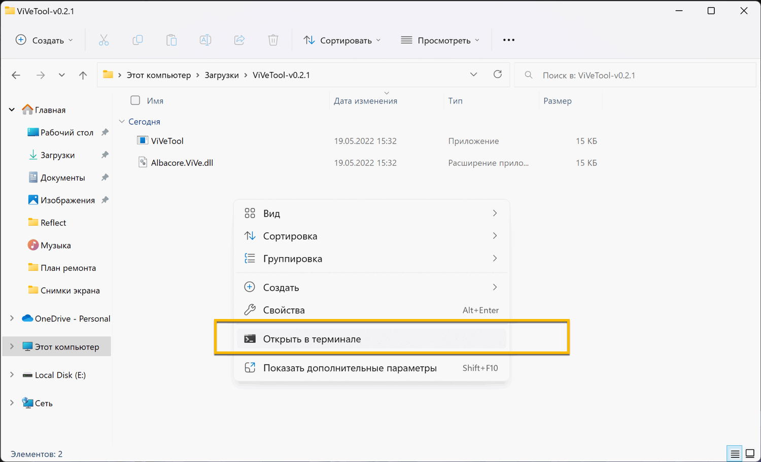 - Перейдите в папку ViveTool и нажмите правой кнопкой мыши в любом свободном месте папки – выберите Открыть в терминале.