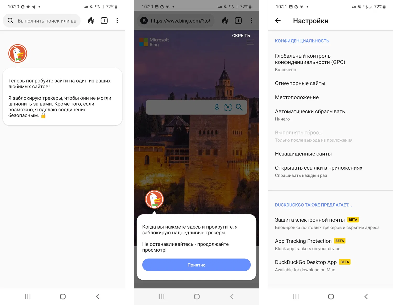 Компания DuckDuckGo также предлагает приватный браузер DuckDuckGo Privacy Browser для iOS и Android, который поддерживает множество функций конфиденциальности, включая шифрование HTTPS, блокировку сторонних файлов cookie и блокировку трекеров.