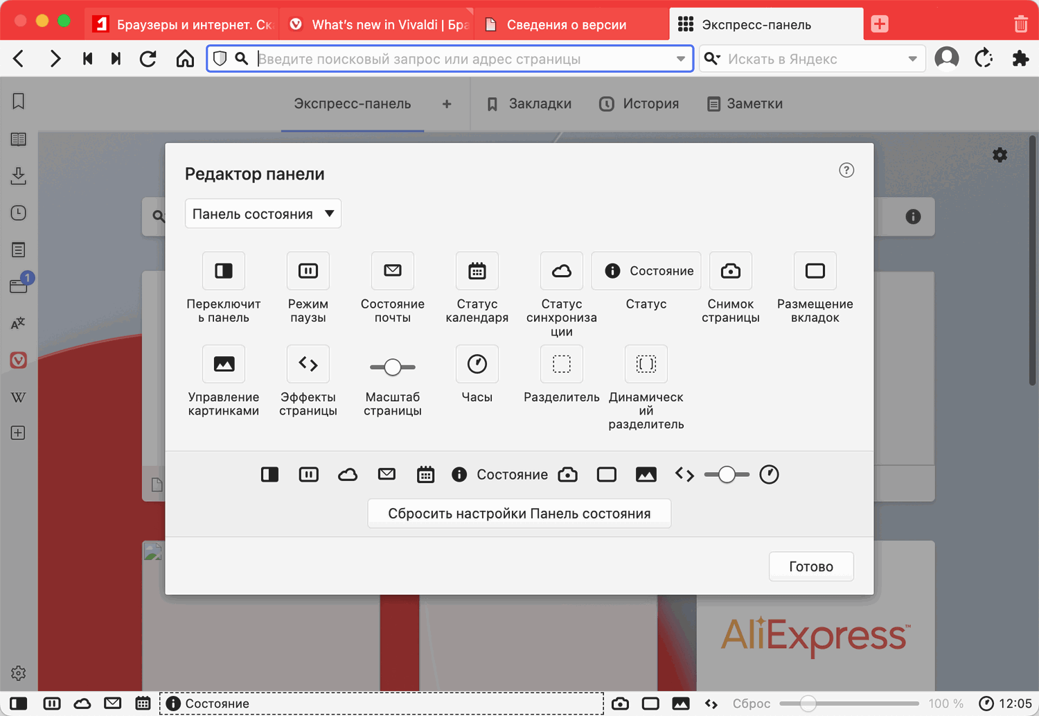 Щелкните правой кнопкой мыши строку состояния и выберите Изменить > Настроить панель, чтобы отобразить редактор панели. Вы также можете выбрать Меню Vivaldi > Вид > Настроить панель, чтобы открыть то же меню.