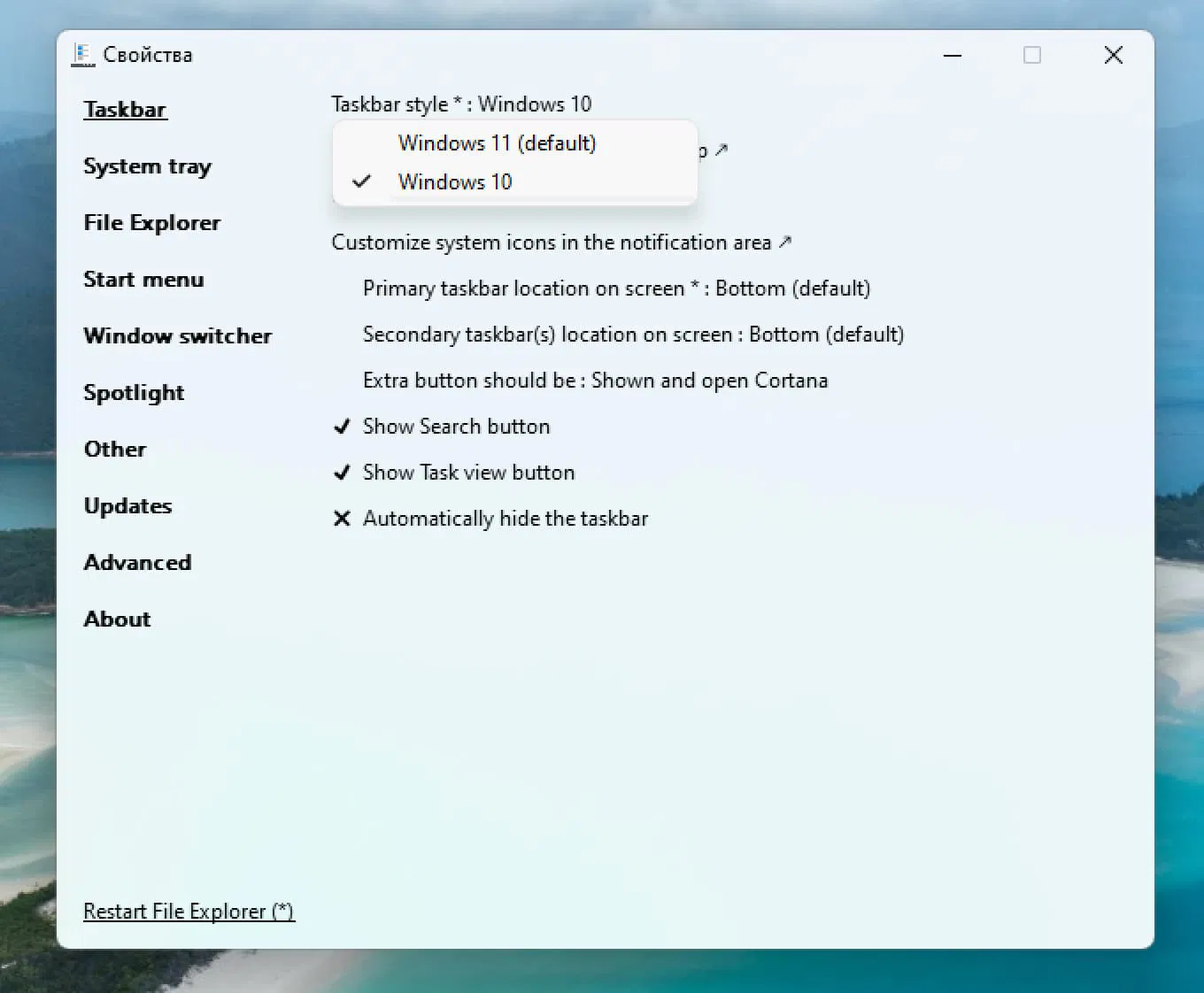 Примечание: Если вы не видите эту опцию в ExplorerPatcher, возможно, вы загрузили стабильную версию программы. Параметр доступен только в предварительной версии 22000.708.46.4.