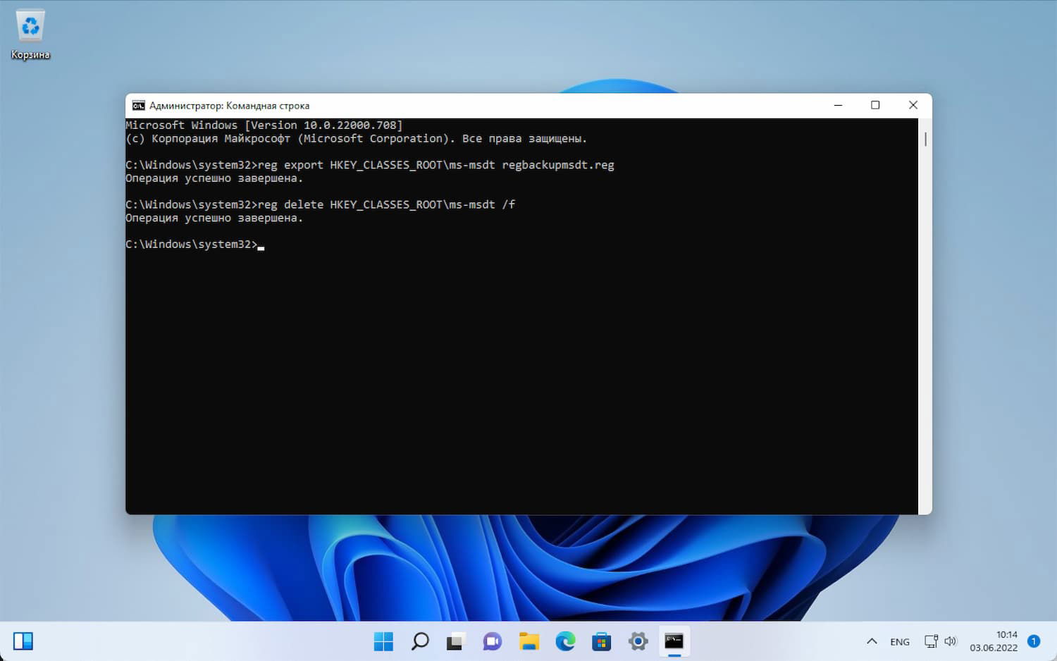 - Чтобы создать резервную копию ключа ms-msdt, выполните команду: