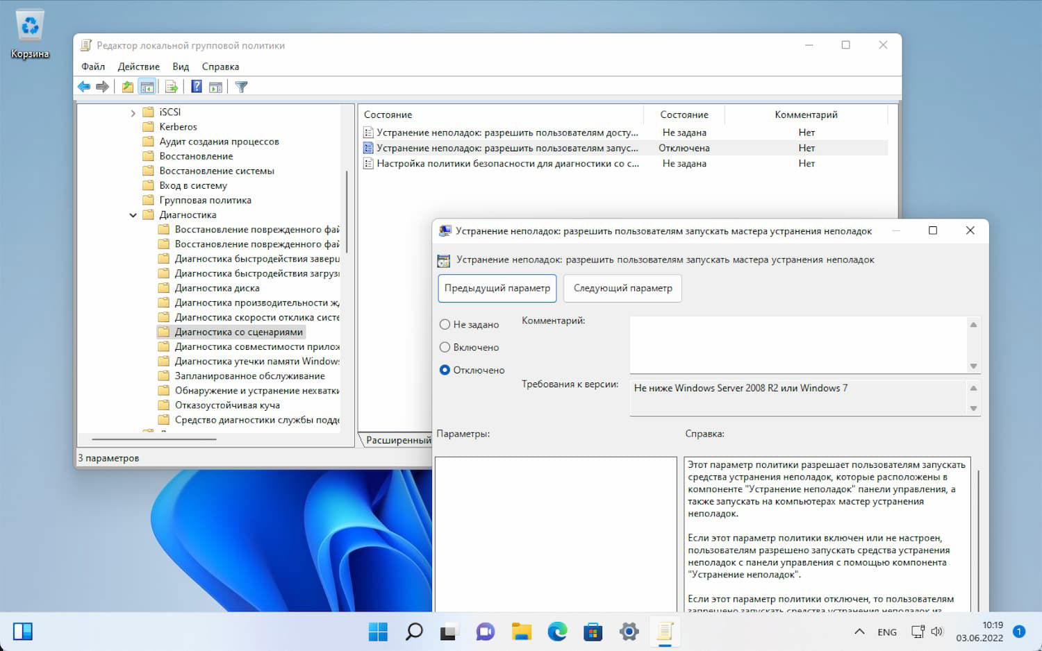 Обратите внимание, изменение статуса политики лишает пользователя возможности запускать средства устранения неполадок в системе. Вы можете отменить изменение в любое время, установив для политики состояние Не настроено (по умолчанию) или Включено. Системные администраторы могут отменить изменение, как только Microsoft выпустит официальный патч.