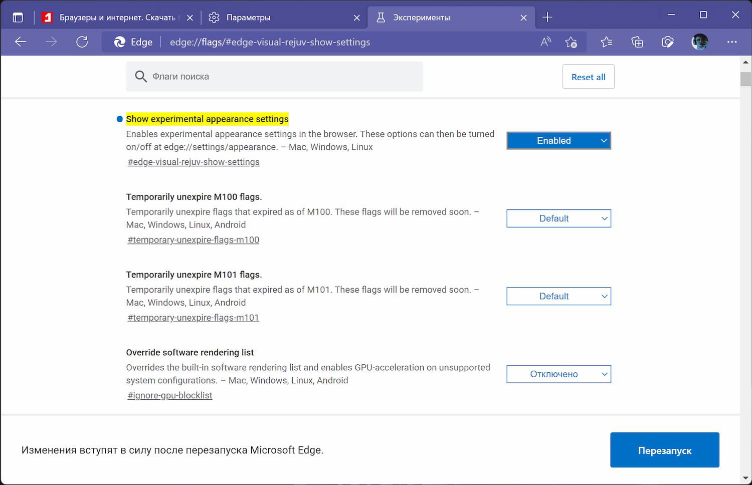 - Установите значение Enabled для параметра Show experimental appearance settings и перезапустите браузер.