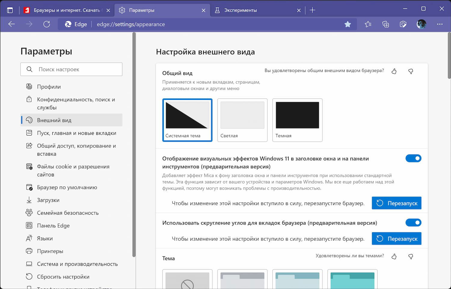 - Перейдите в Настройки > Внешний вид и установите переключатели Показывать визуальные эффекты Windows 11 в панели заголовка и на панели инструментов (предварительная версия), а также Использовать скругление углов для вкладок браузера (предварительная версия) в активное положение.