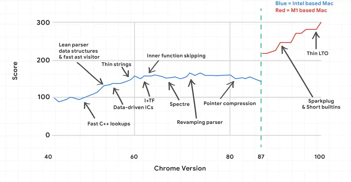С другой стороны, реализация компилятора JavaScript V8 Sparkplug вместе с короткими встроенными вызовами помогла Chrome сократить накладные расходы, что привело к повышению производительности с точки зрения памяти. Технология ThinLTO (оптимизация времени соединения) также сыграла ключевую роль в повышении производительности Chrome.