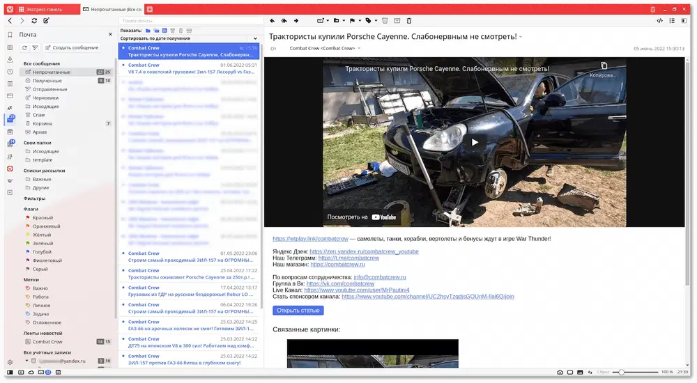 По умолчанию Vivaldi отображает все сообщения на боковой панели. Там расположены папки по умолчанию, в том числе Непрочитанные, Полученные и Черновики, а также специальные папки для списков рассылки, фильтров, флагов, меток и отдельных аккаунтов, добавленных в почтовый клиент.
