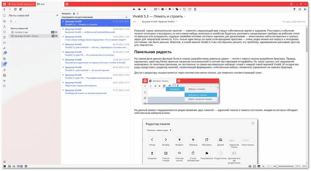 Новая версия «Почты Vivaldi» является очень крупным обновлением. Почтовый клиент интегрирован непосредственно в браузер Vivaldi для удобного доступа к электронной почте и поставляется с календарем и новостной лентой. Почта Vivaldi поддерживает ряд функций повышения производительности, которые могут улучшить работу пользователей с клиентом.
