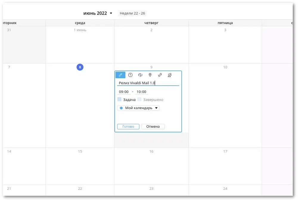 Календарь получил собственное представление в Vivaldi, в котором перечислены все предстоящие события на небольшой боковой панели слева. По клику событие раскрывается и сворачивается, а на панели есть возможность легко изменить период времени.