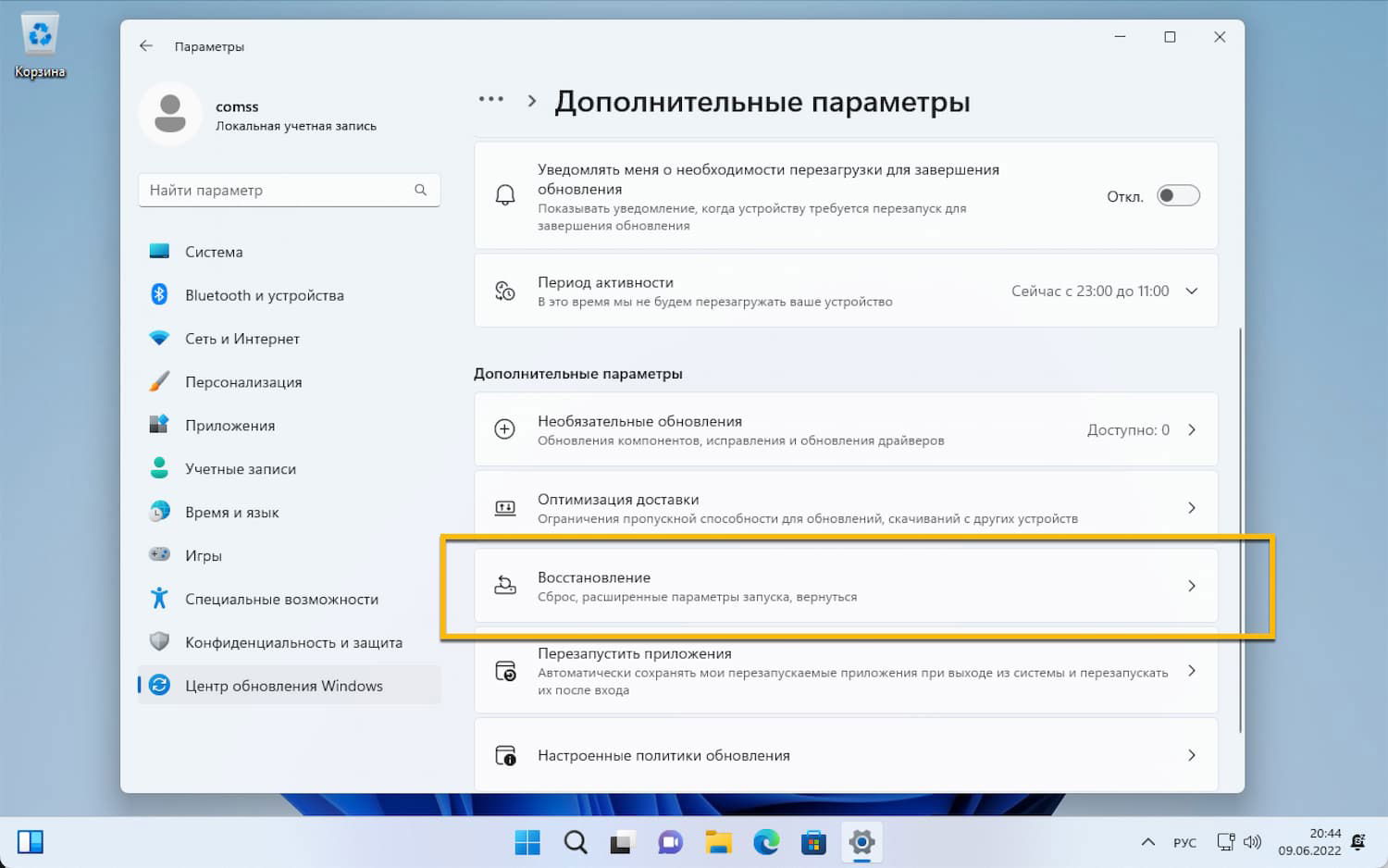 - Выберите опцию Восстановление.