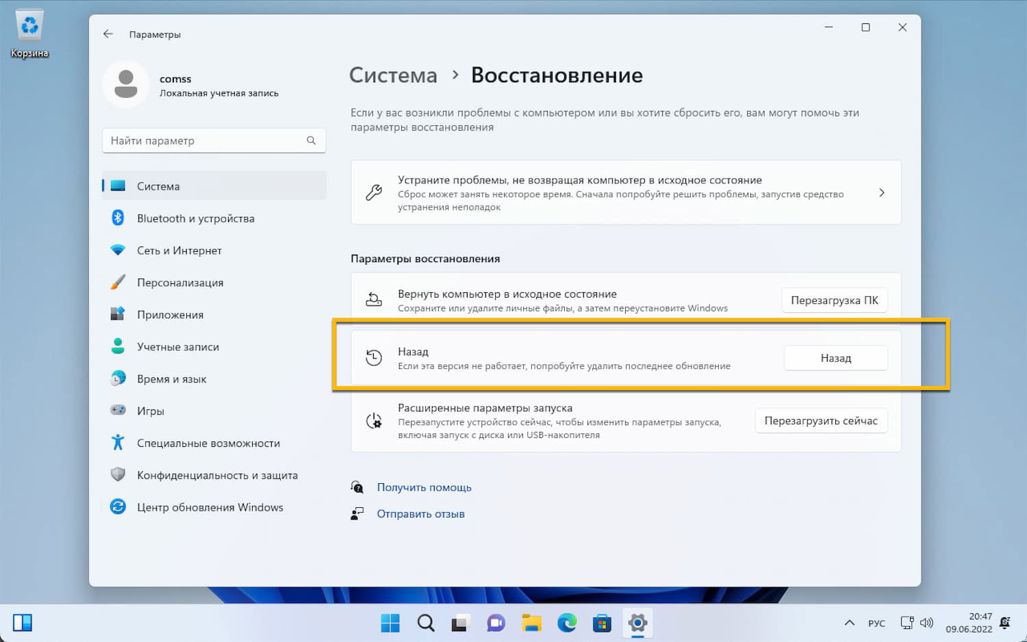 - Найдите раздел Параметры восстановления и нажмите кнопку Назад.