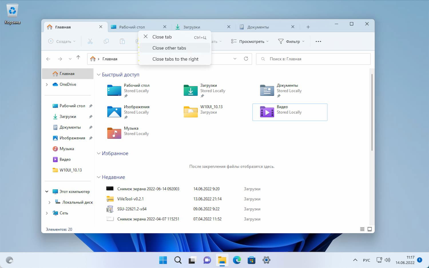 Контекстное меню предназначено для управления открытыми вкладками в Проводнике, например, для закрытия вкладок. Также поддерживается изменение порядка вкладок с помощью перетаскивания.