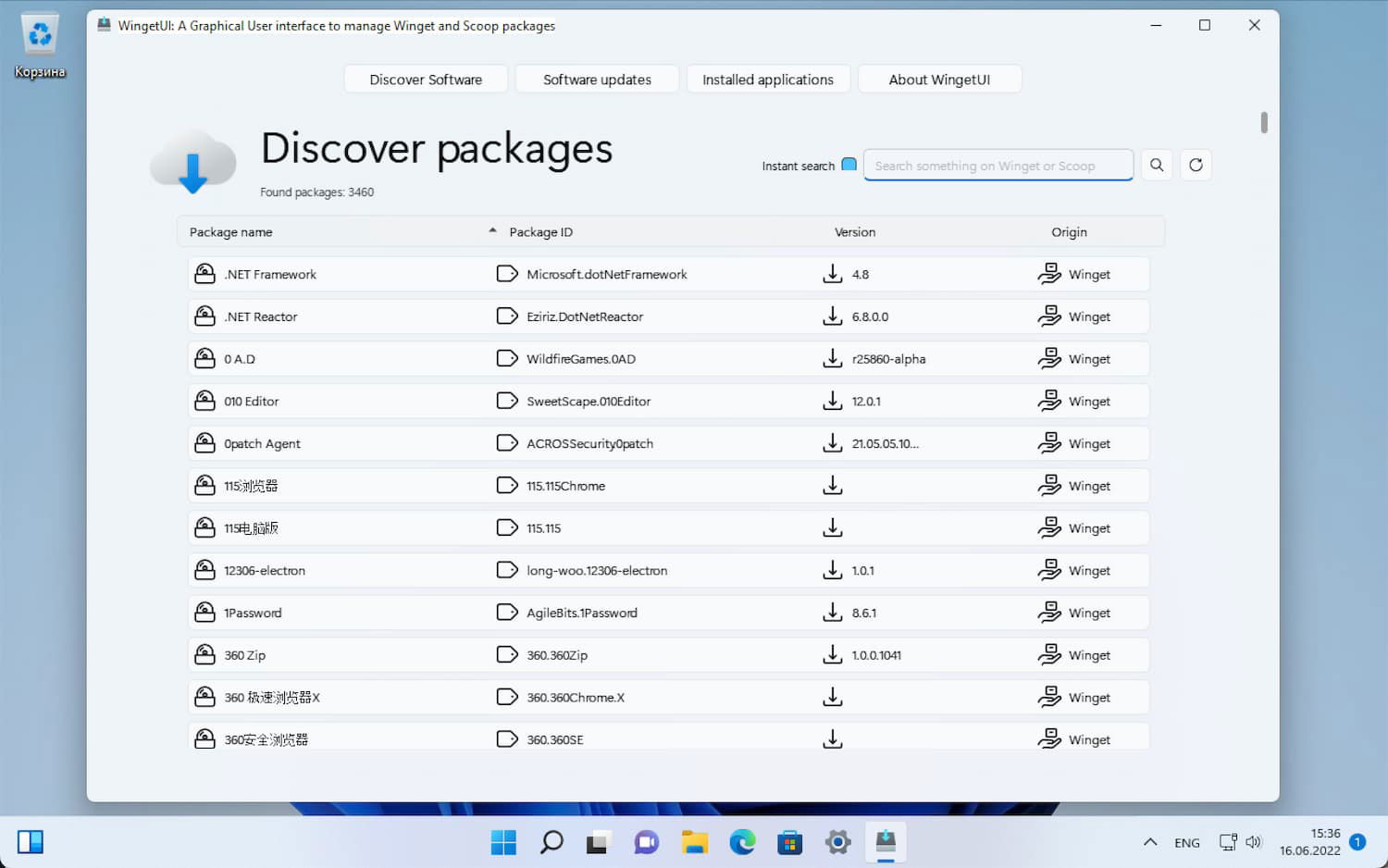 Размер WingetUI составляет 60 мегабайт. Для использования программы требуется установка. Поддерживаются ОС Windows 10 версии 1809 или выше и Windows 11. После запуска инструмент извлекает данные из основного репозитория для формирования списка доступных программ. Каждая программа указана вместе с именем, идентификатором пакета и версией. Хотя вы можете просматривать репозиторий вручную, можно воспользоваться поиском по программам.