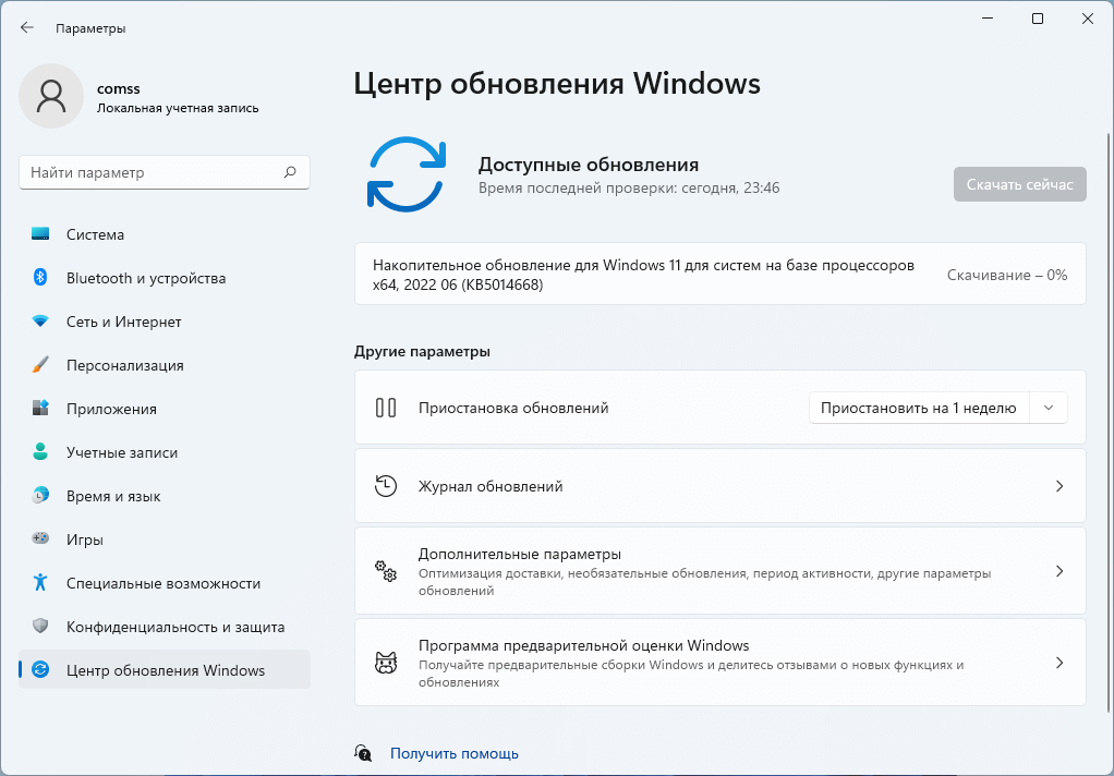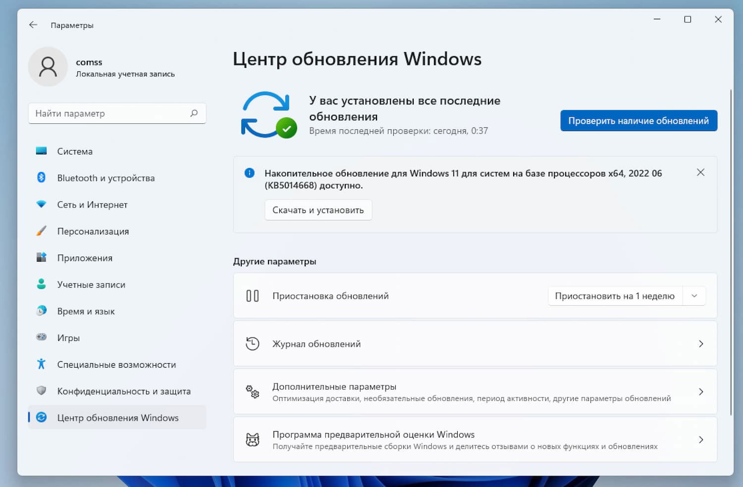 Когда вы увидите, что доступно Накопительное обновление для Windows 11 для систем на базе процессоров x64, 2022 06 (KB5014668) доступно нажмите Скачать и установить.