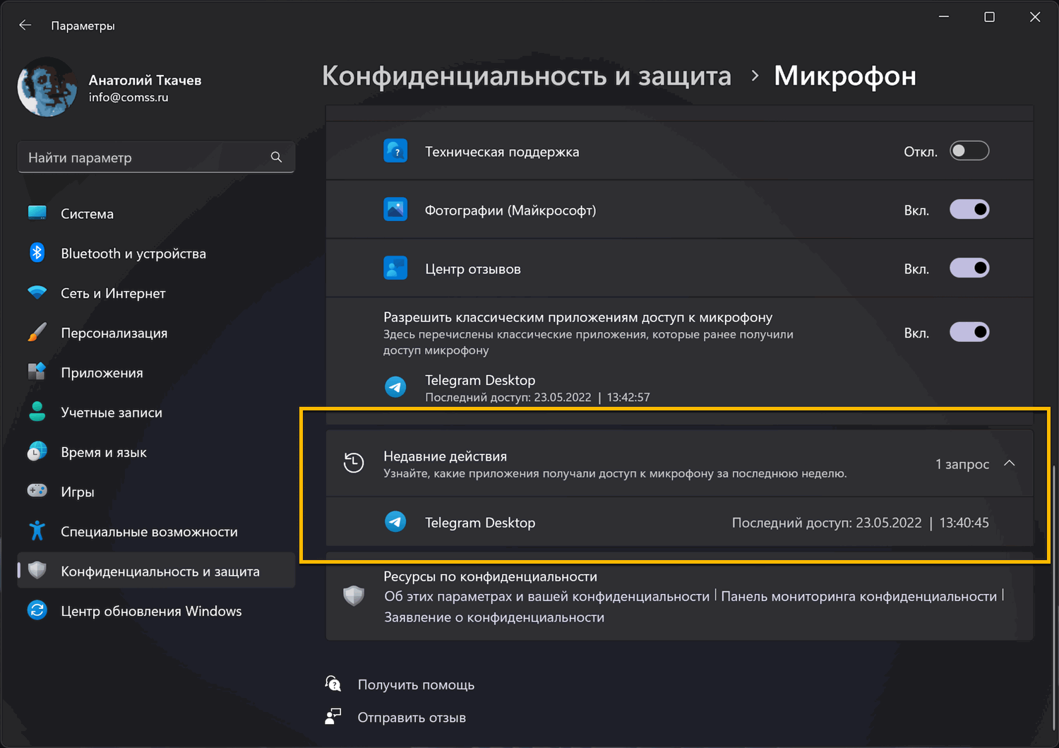 Список «любопытных приложений» доступен в приложении Параметры > Конфиденциальность и защита > Разрешения приложений. Для каждой категории данных доступно выпадающее меню Недавние действия.