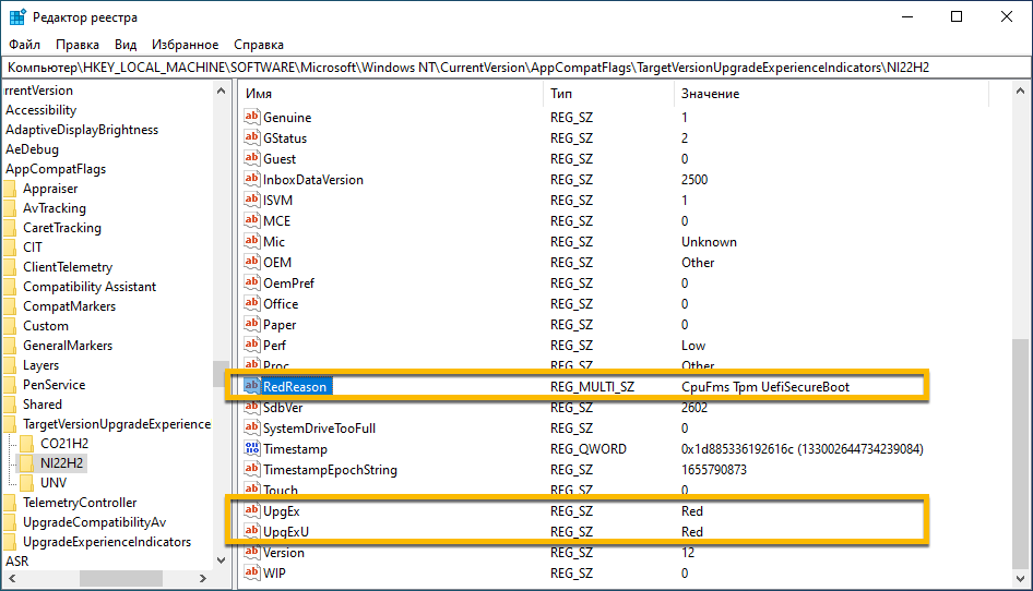 Внутри этой папки значения ключей UpEx и UpExU равняться Green в случае системы, готовой для получения Windows 11, версия 22H2. При этом значение ключа RedReason должно быть None. У несовместимых систем значения UpEx и UpExU будут Red, а в RedReason будут перечислены причины, которые делают систему несовместимой, например отсутствие TPM 2.0 или безопасной загрузки (Secure Boot).