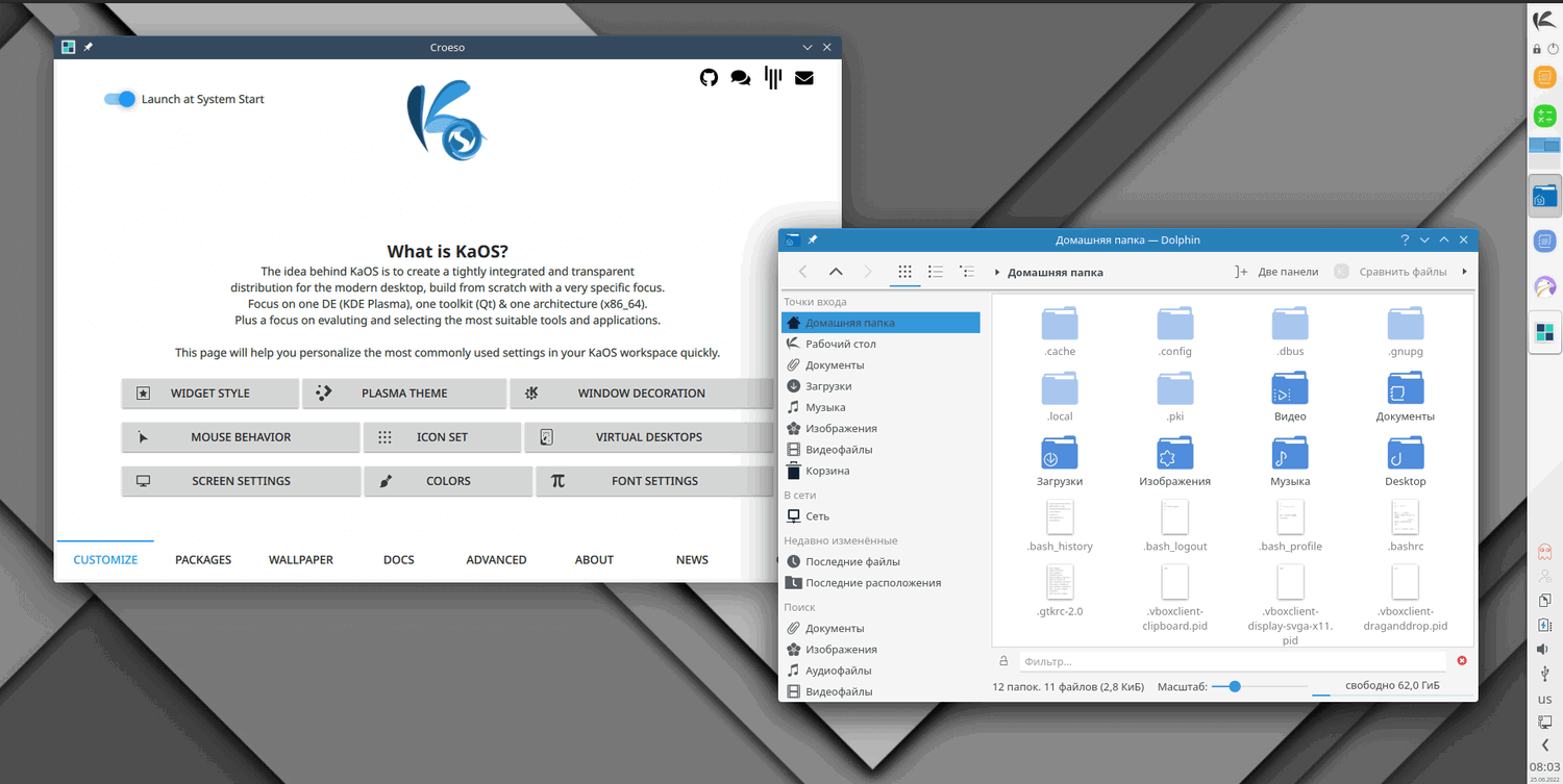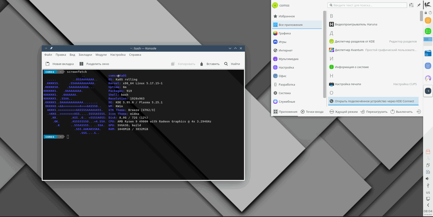 KaOS Linux 2022.06 использует версию рабочего окружения KDE Plasma 5.25.1, KDE Frameworks 5.95 и KDE Gear 22.04.2.