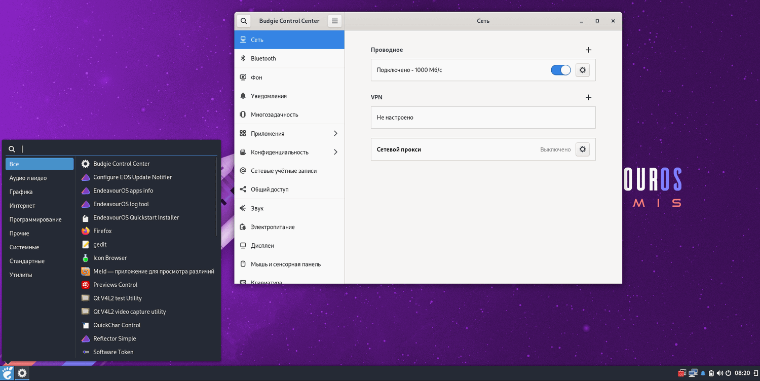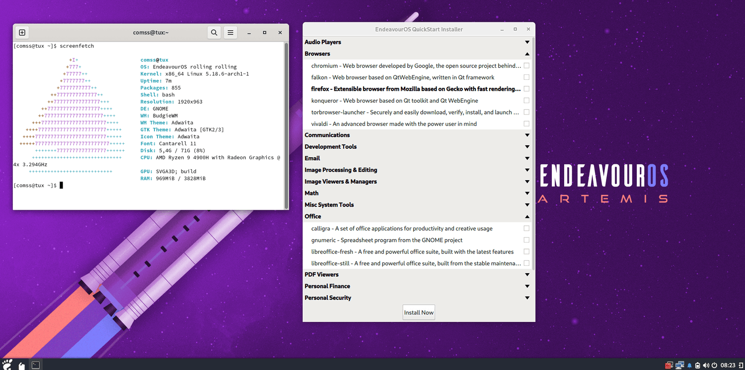 EndeavourOS Artemis также поставляется с WirePlumber в качестве менеджера сеансов и политик по умолчанию для PipeWire, Budgie Control Center, чтобы предложить вам более плавную и нативную работу рабочего стола Budgie, значительно улучшенный автономный установщик Xfce и поддержку понижения пакетов с помощью нового инструмента командной строки - eos-downgrade.