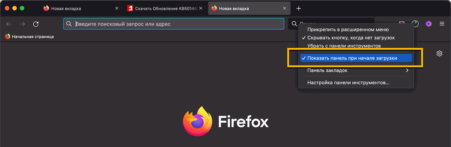 Для этого щелкните правой кнопкой мыши по значку загрузки и выберите Показать панель при начале загрузки. Если перед этим пунктом нет галочки, то Firefox не будет отображать панель загрузки.