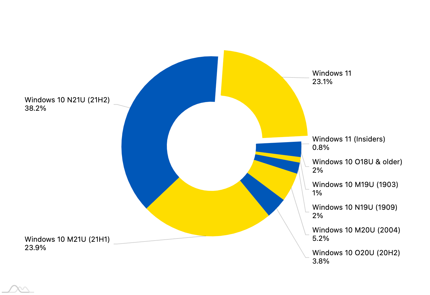 Менее 3,5 процентов современных ПК с Windows обновились до Windows 11 за последние 2 месяца. Примерно столько же перешли на последнюю версию Windows 10 (21H2).