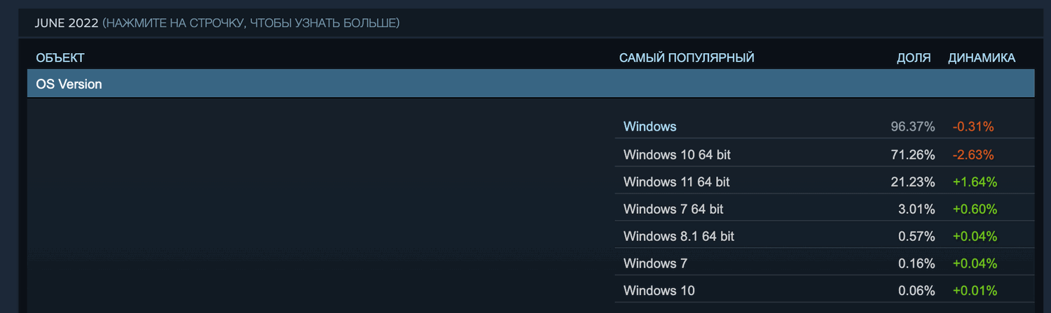 Компания Valve опубликовала результаты новейшего исследования Steam, в которых приводятся предпочтения пользователей игровой платформы в отношении программного обеспечения и аппаратной начинки. Согласно июньскому отчету 2022 года Windows 11 преодолела отметку в 20% и достигла доли в 21,23% пользователей (месячный прирост + 1,64%). Данные Steam хорошо согласуются со статистикой компании AdDuplex, которая ранее сообщала, что доля Windows 11 на рынке ОС Windows достигла 23%.