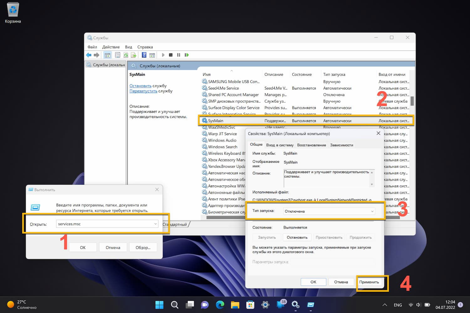 services.mscи нажмите Enter: - В окне «Службы» на правой панели найдите запись с именем SysMain. Затем щелкните правой кнопкой мыши эту запись и выберите Остановить.