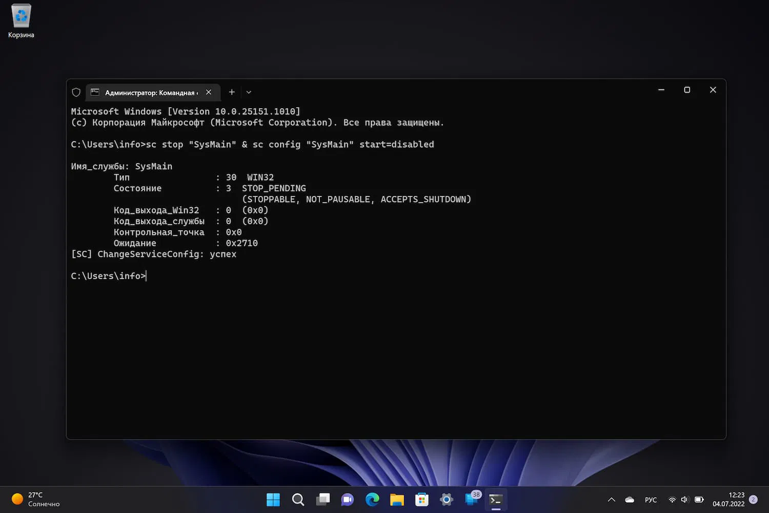 Отключение Superfetch (SysMain) с помощью командной строки