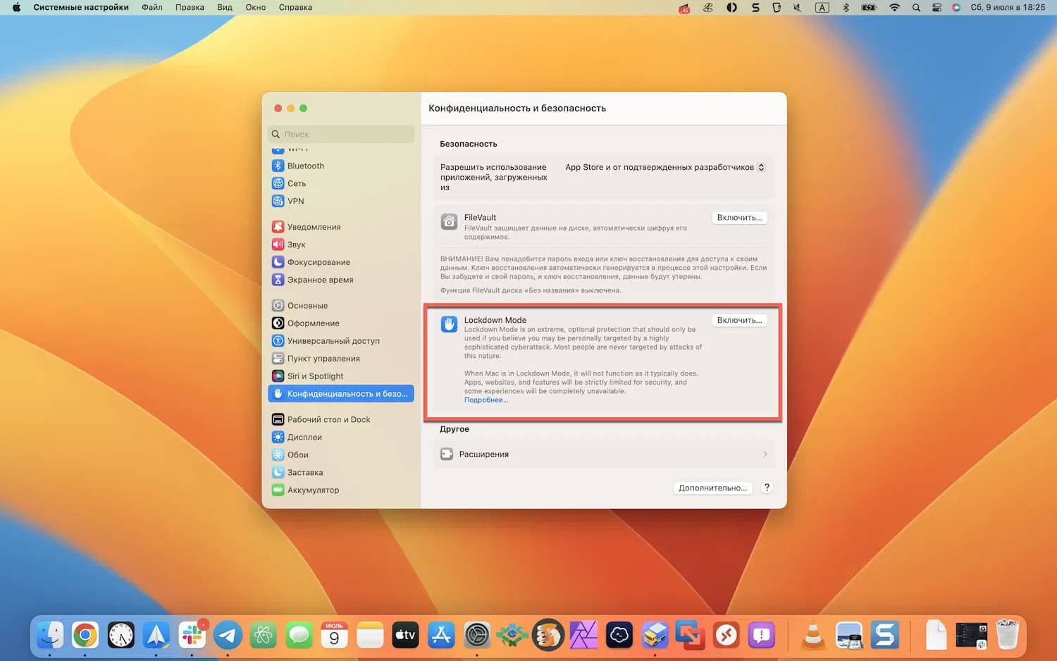Режим локдауна будет отключен по умолчанию, но его можно будет включить в разделе «Конфиденциальность и безопасность» приложения «Настройки» или «Системные настройки». После включения режим блокировки можно отключить в любое время в том же разделе приложения «Настройки». Включение или отключение режима блокировки требует перезагрузки устройства и ввода пароля устройства.