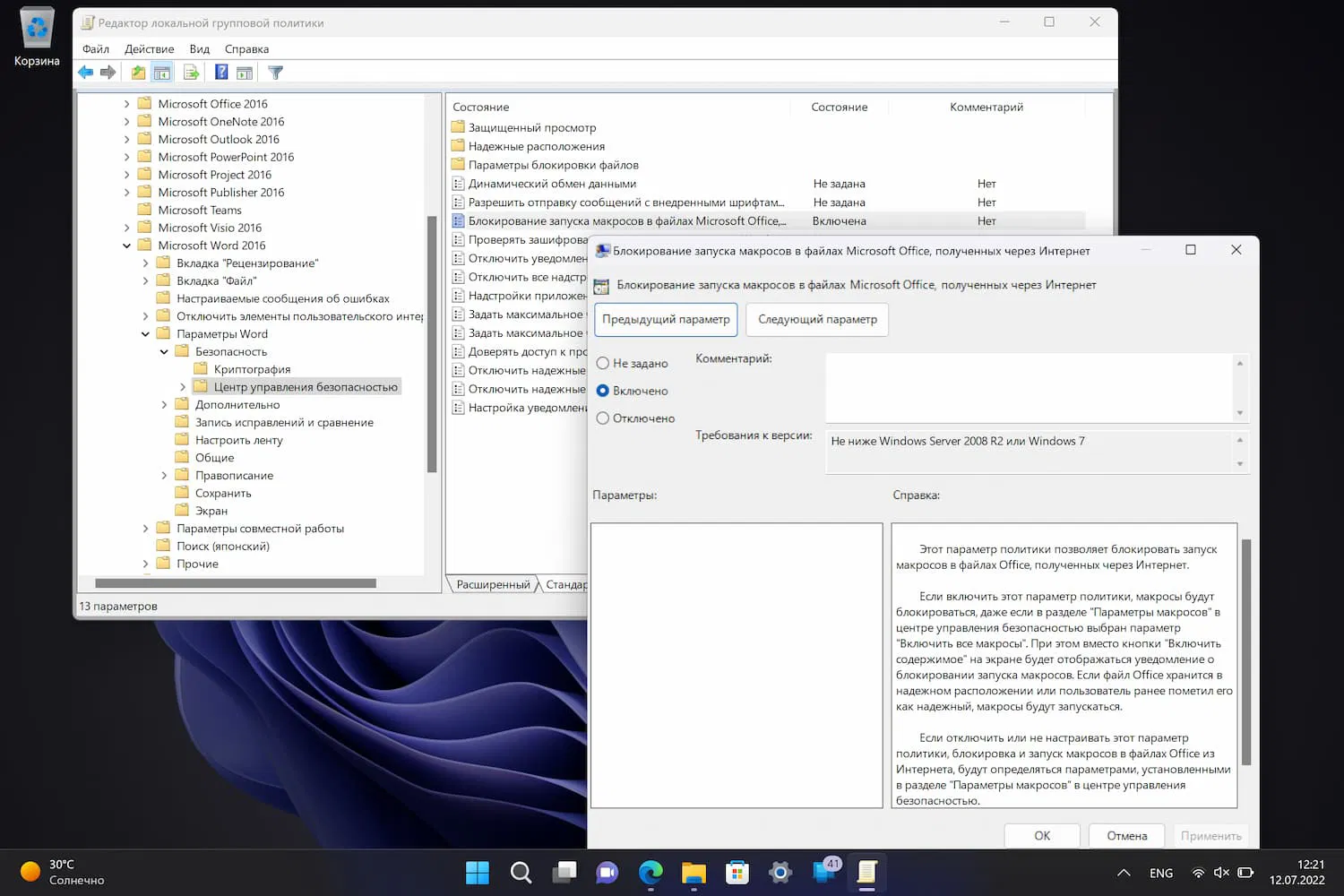 Эти политики находятся в разделе Конфигурация пользователя > Административные шаблоны > [Приложение Office] > Параметры [Приложение Office] > Безопасность > Центр управления безопасностью.