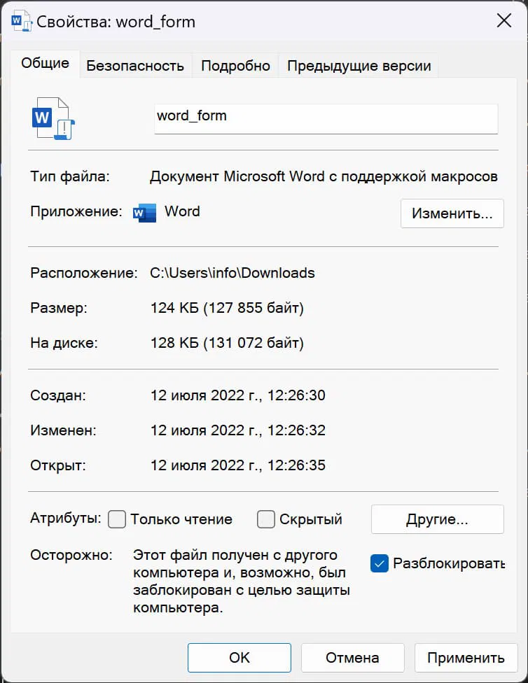 Если вы доверяете этому документу и уверены в его безопасности, вы можете удалить «Mark-of-the-Web», зайдя в свойства файла, отметьте Разблокировать в разделе Общие > Осторожно, а затем нажмите кнопку Применить, как показано ниже.