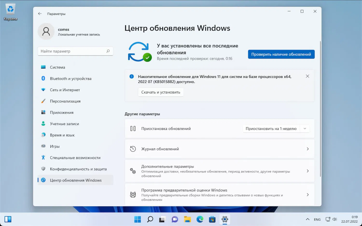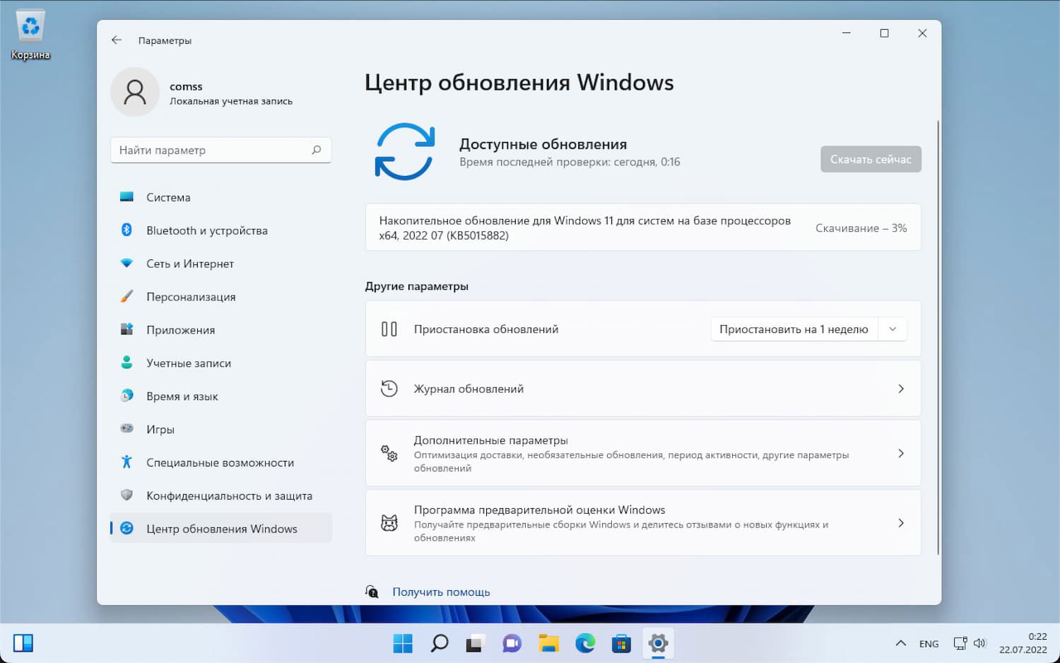 Когда вы увидите, что доступно Накопительное обновление для Windows 11 для систем на базе процессоров x64, 2022 07 (KB5015882) доступно нажмите Скачать и установить.