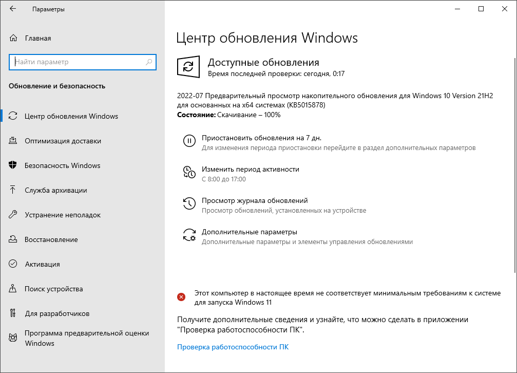 Накопительное обновление 5015878 для ПК устанавливается вручную через Центр обновления Windows. Для проверки перейдите в меню Параметры > Обновление и безопасность и нажмите Проверить наличие обновлений.