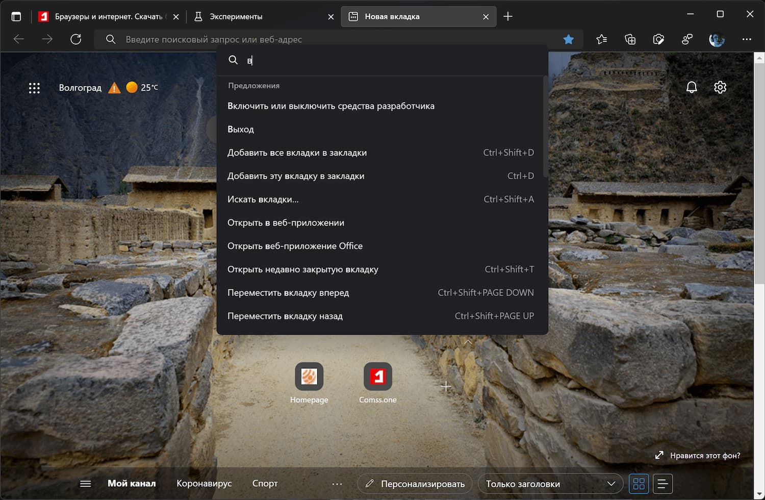 Палитра команд является экспериментальной функцией, которая может стать доступна в стабильных версиях Edge, а может быть удалена.