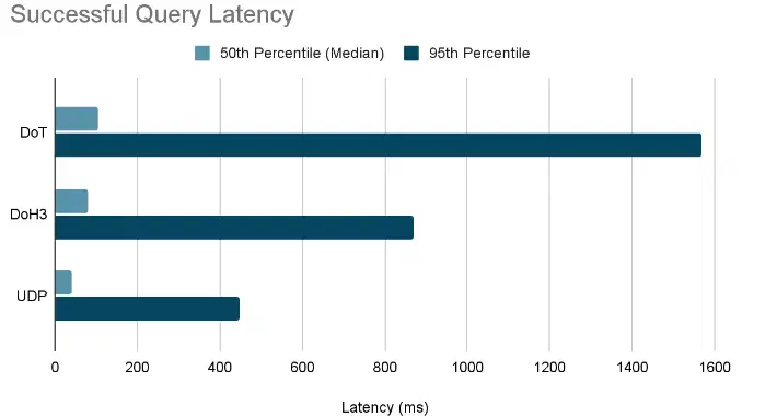 В DoH3 решены многие проблемы производительности DoT, и, согласно тестам Google, достигается увеличение производительности на 24% для медианного времени запроса. В некоторых отдельных случаях производительность увеличилась до 44%.