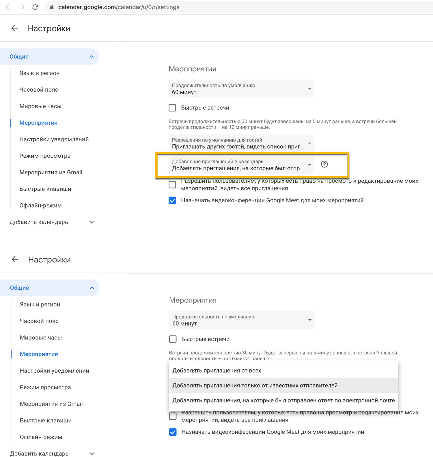 - Найдите там меню Добавление приглашений в календарь и выберите подходящую опцию:
