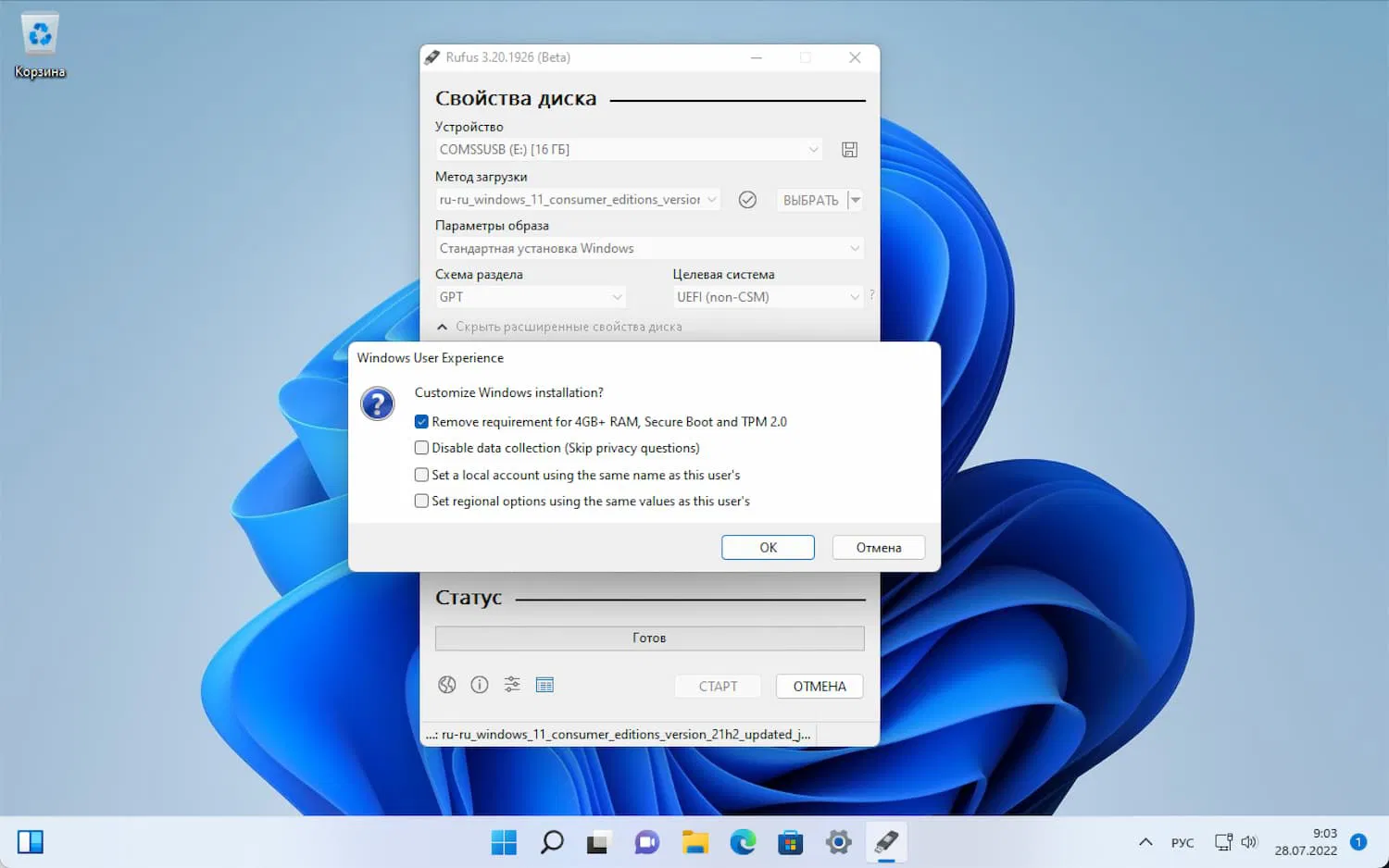 Недавно Rufus стало пользоваться популярностью среди пользователей Windows 11, которые не хотят иметь дело со странными политиками и правилами новой системы. Приложение может создать установочный носитель Windows 11 с обходом требований TPM и безопасной загрузки и с автоматическим отклонением запросов на сбор данных. Версия Rufus 3.19, доступная на стабильном канале, получила востребованную возможность обойти требование учетной записи Microsoft во время первоначальной настройки.