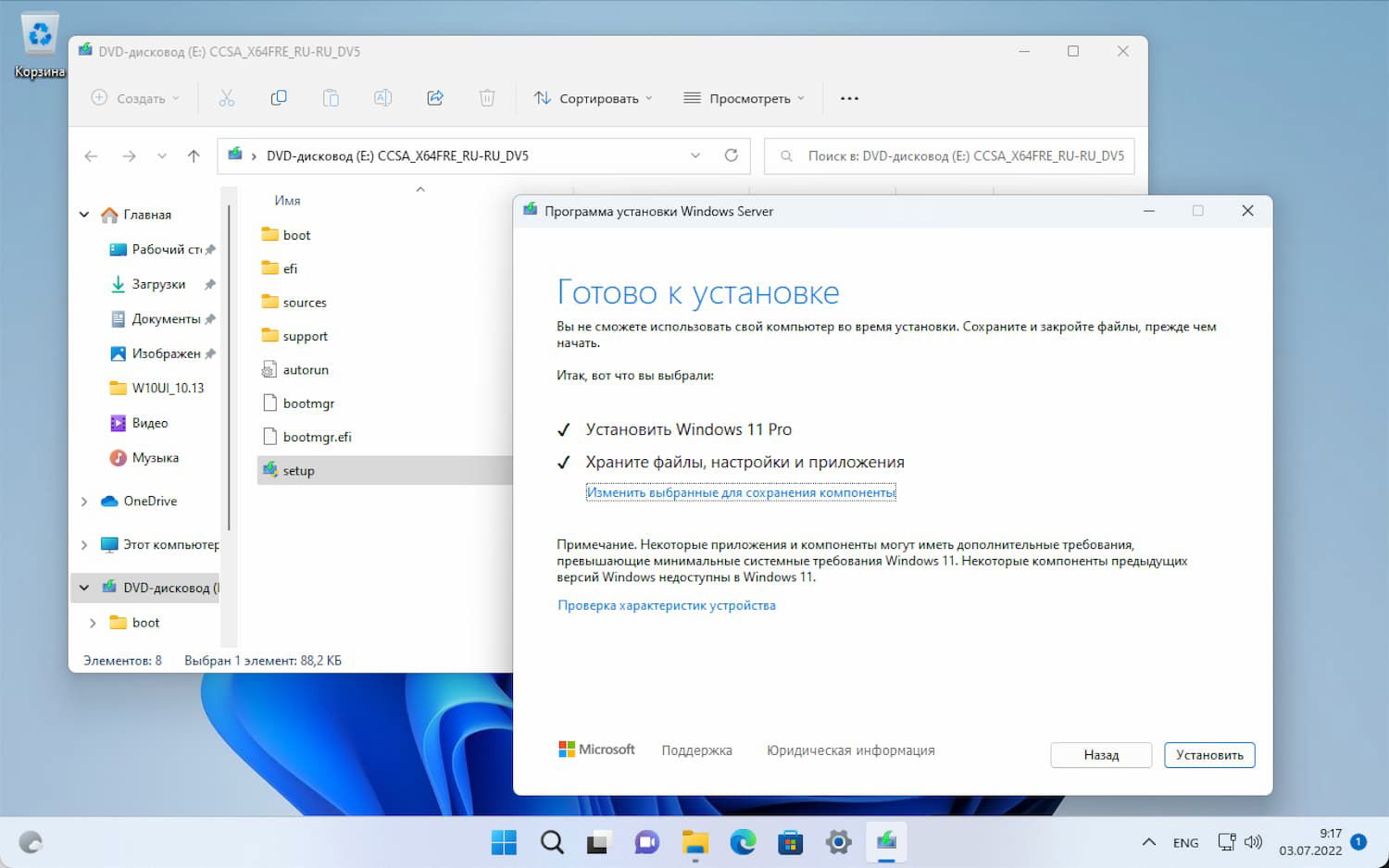 - Запустите установку с помощью файла setup.exe, выбрав параметр Храните файлы, настройки и приложения. После обновления у вас будет установлена Windows 11, Версия 22H2 (Сборка ОС 25169.1000).