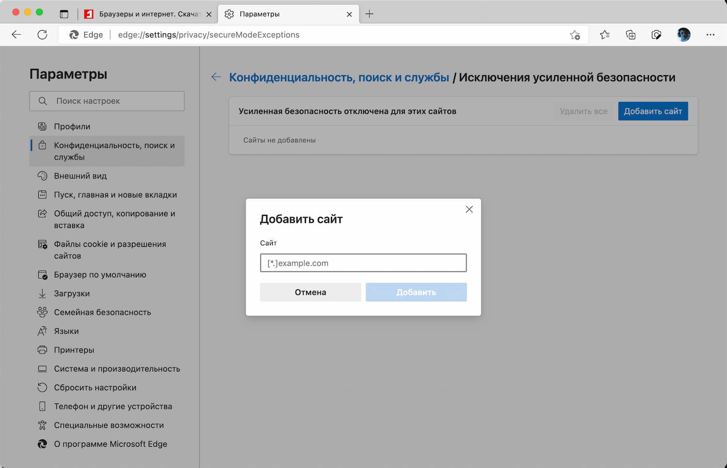 Примечание: В настоящее время WebAssembly не поддерживается. Сайты, которые используют эту технологию, необходимо добавить в список исключений, чтобы убедиться, что они работают в Edge после включения режима безопасности.