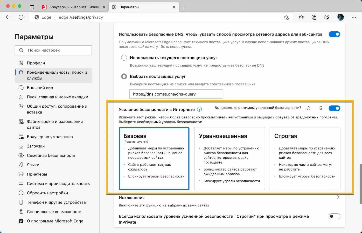 edge://settings/privacy - Прокрутите страницу до раздела Усиление безопасности в Интернете.