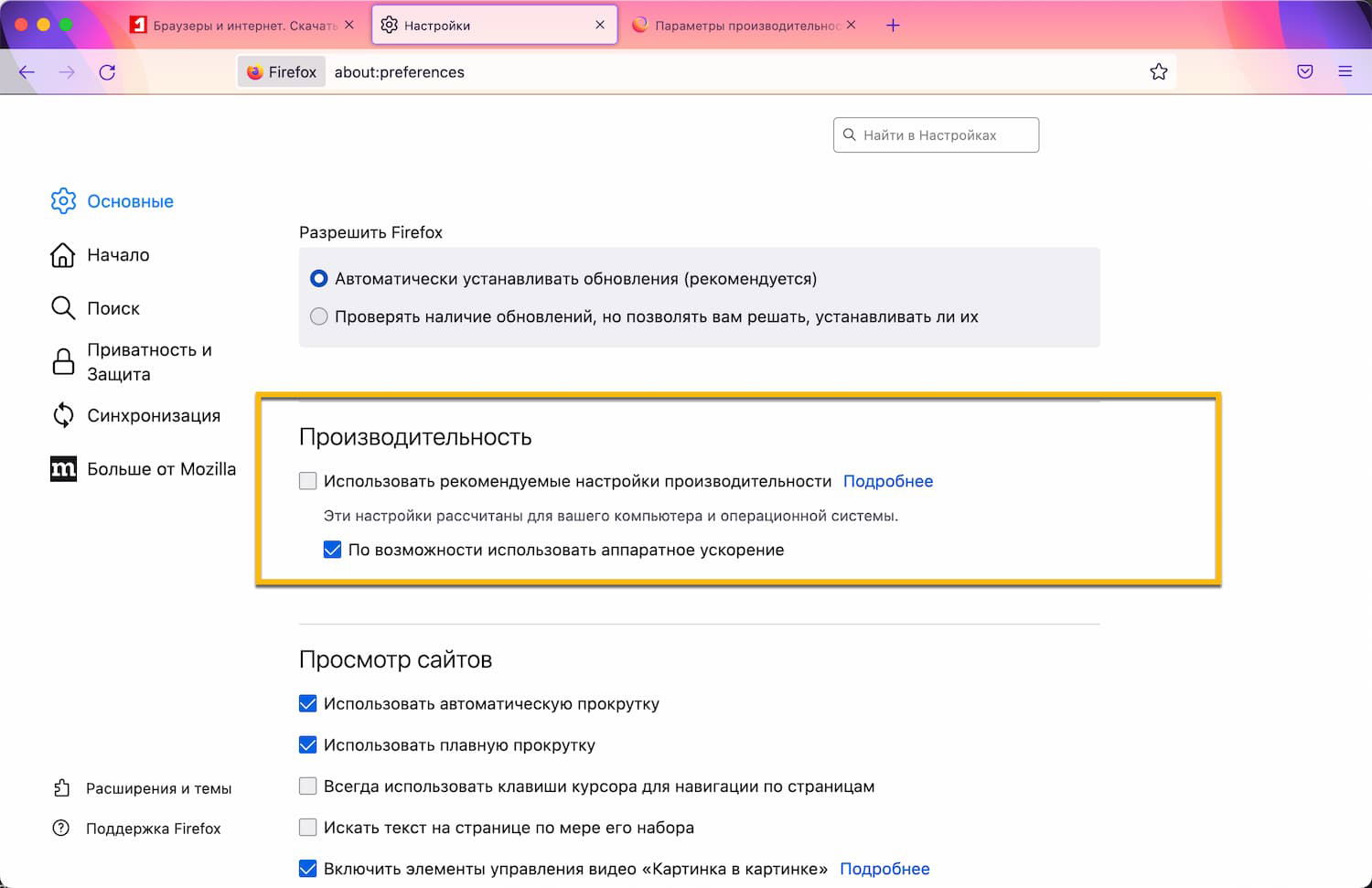 about:preferencesв браузере. - Прокрутите вниз, пока не дойдете до категории «Производительность».