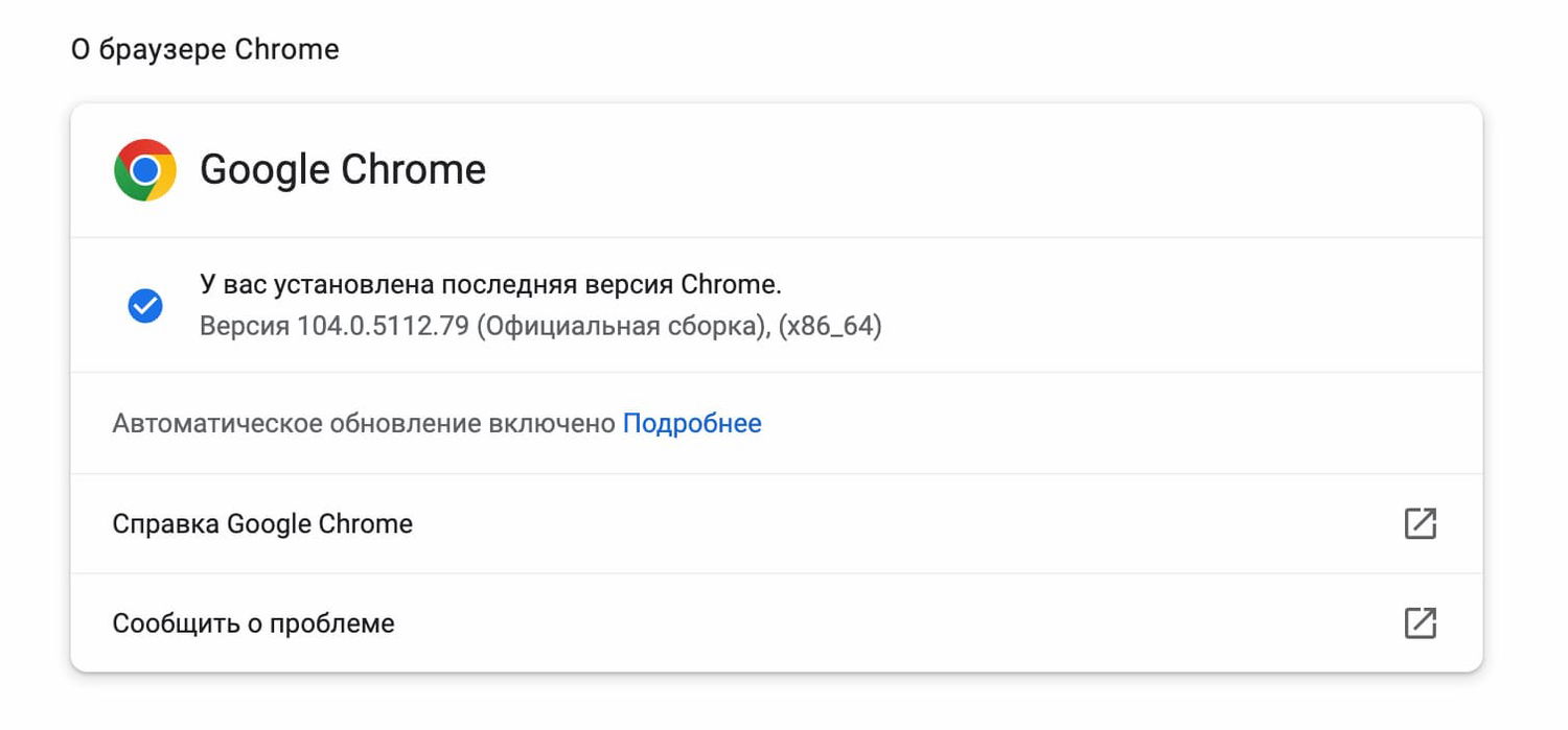 Чтобы проверить версию Google Chrome, перейдите в меню > Справка > О браузере Google Chrome или откройте страницу chrome://settings/help. Если обновление будет доступно, то браузер автоматически скачает и установит свежую версию. Для завершения установки обновления потребуется перезапуск браузера.